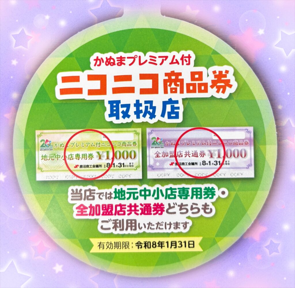 当店は【かぬまプレミアム付ニコニコ商品券】の