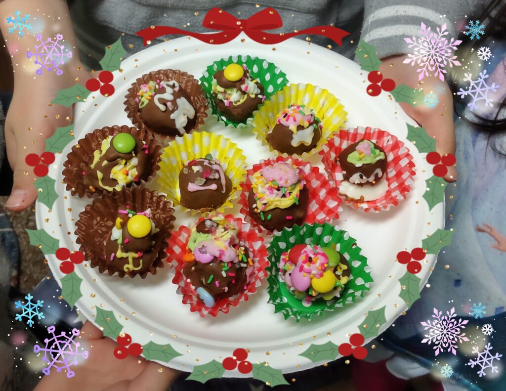 サンタさんの顔をチョコペンで描いたり、