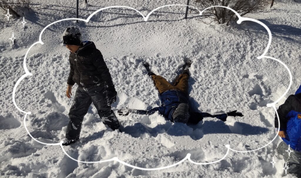 雪の上にダイブして人型を作るパパさん。