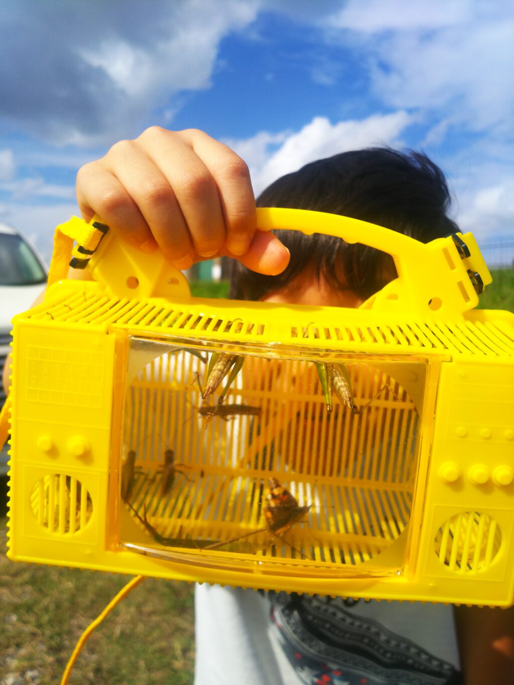 虫かごを覗くと、チョウチョ・バッタ・トンボ……と色々な虫たち